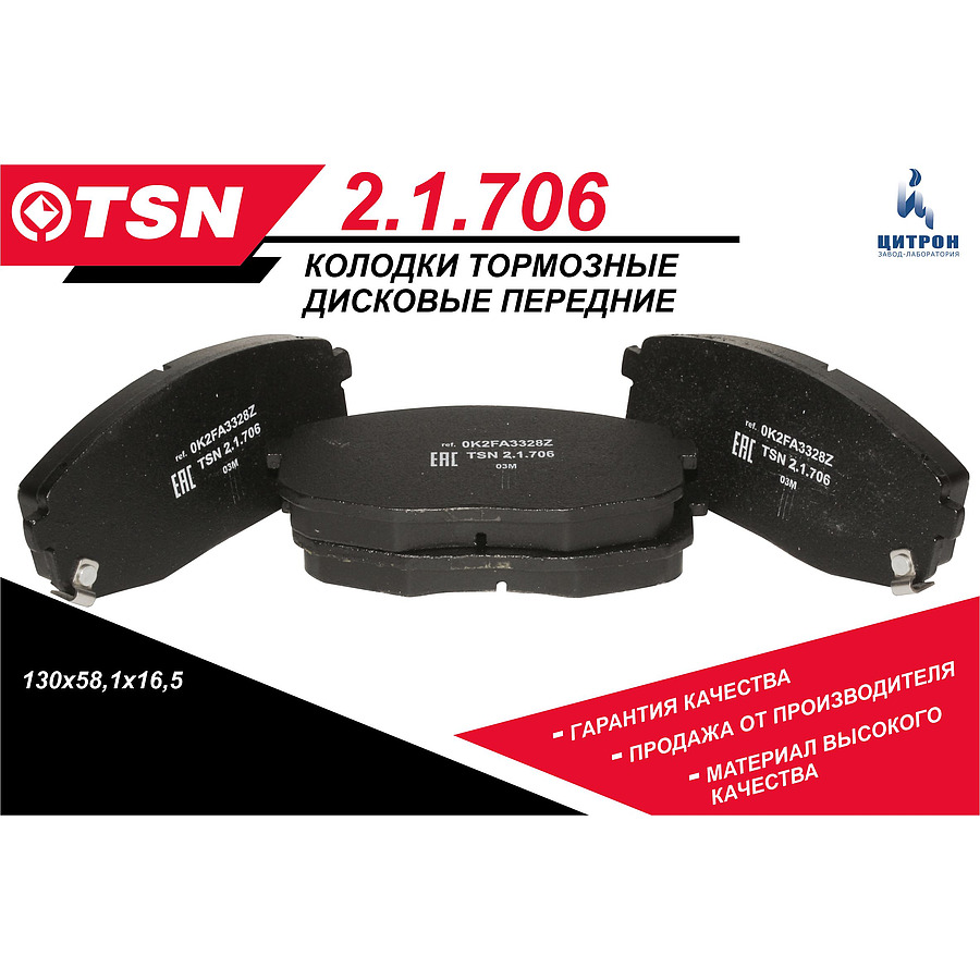 Колодка переднего тормоза HYUNDAI: Creta I/II, i30 I; KIA: Cerato II, Soul II, Carens I, Ceed I ЦИТРОН 2.1.706 отсутсвует